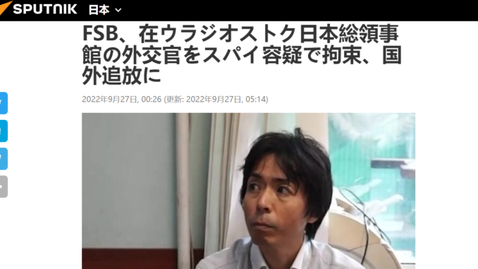 From “FSB Detains Diplomat at Japanese Consulate General in Vladivostok on Spying Charges, Deports Him” (https://sputniknews.jp/20220927/13094568.html), Sputnik Japan, September 27, purportedly Consul General Motoki Tatsunori